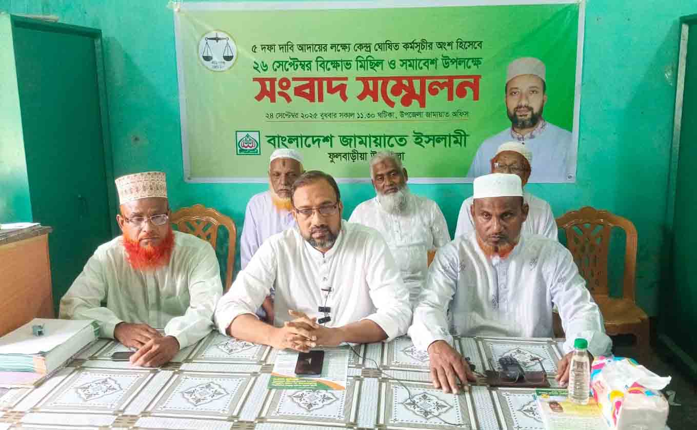 গতকাল বুধবার দুপুরে ফুলবাড়িয়া উপজেলা জামায়াতে ইসলামীর দলীয় কার্যলয়ে সংবাদ সম্মেলনে তিনি আরও বলেন আমরা চাই জনগণ যেনো ভোটের মাধ্যমে তাঁদের নিরপক্ষ মতামত দিতে পারেন। ৫ দফা দাবি আদায়ের লক্ষ্যে কেন্দ্র ঘোষিত কর্মসূচীর অংশ হিসেবে আগামী ২৬ সেপ্টেম্বর ফুলবাড়িয়ায় বিক্ষোভ মিছিল ও সমাবেশ উপলক্ষে এ সংবাদ সম্মেলনের আয়োজন করে জামায়াতে ইসলামী ফুলবাড়িয়া। সংবাদ সম্মেলনে উপস্থিত ছিলেন, জামায়াতে ইসলামী নেতা মো. ফজলুল হক শামিম, ডা. আব্দুর রাজ্জাক, আ. রউফ রাব্বানি, আ. মজিদ ও আ. খালেক।